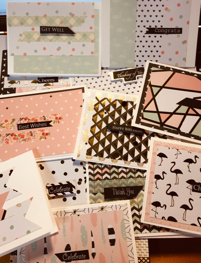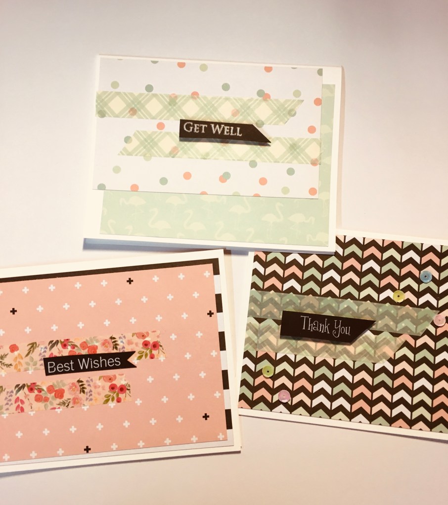 The three in the photo above are my favorites. It’s no coincidence they’re also the ones I used washi tape on and, on the Thank You card, I added sequins that went very well with the color scheme. I really like the floral washi tape on the geometric pattern of the Best Wishes card, and the way I offset the paper and had the washi coming in from both sides on the Get Well card. The downside is that I made a total of 12 cards and only really love three.