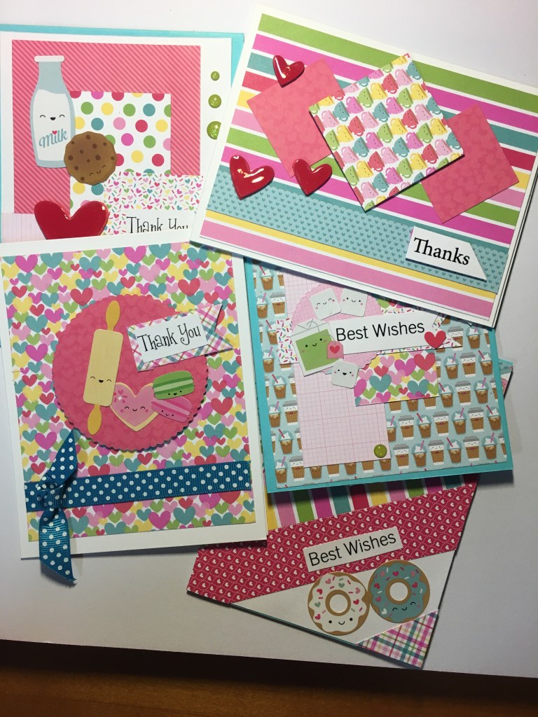 Here are the five cards I made for Week 2 of the Stash Bash. I’m keeping it to five cards at a time to minimize boredom or feeling overwhelmed by the “work” I have to do. I pulled in sketches for three and freestyled two of them. Probably my favorite is the bottom left with the cookies and ribbon. I freestyled that one and I was really pleased with how it came out.