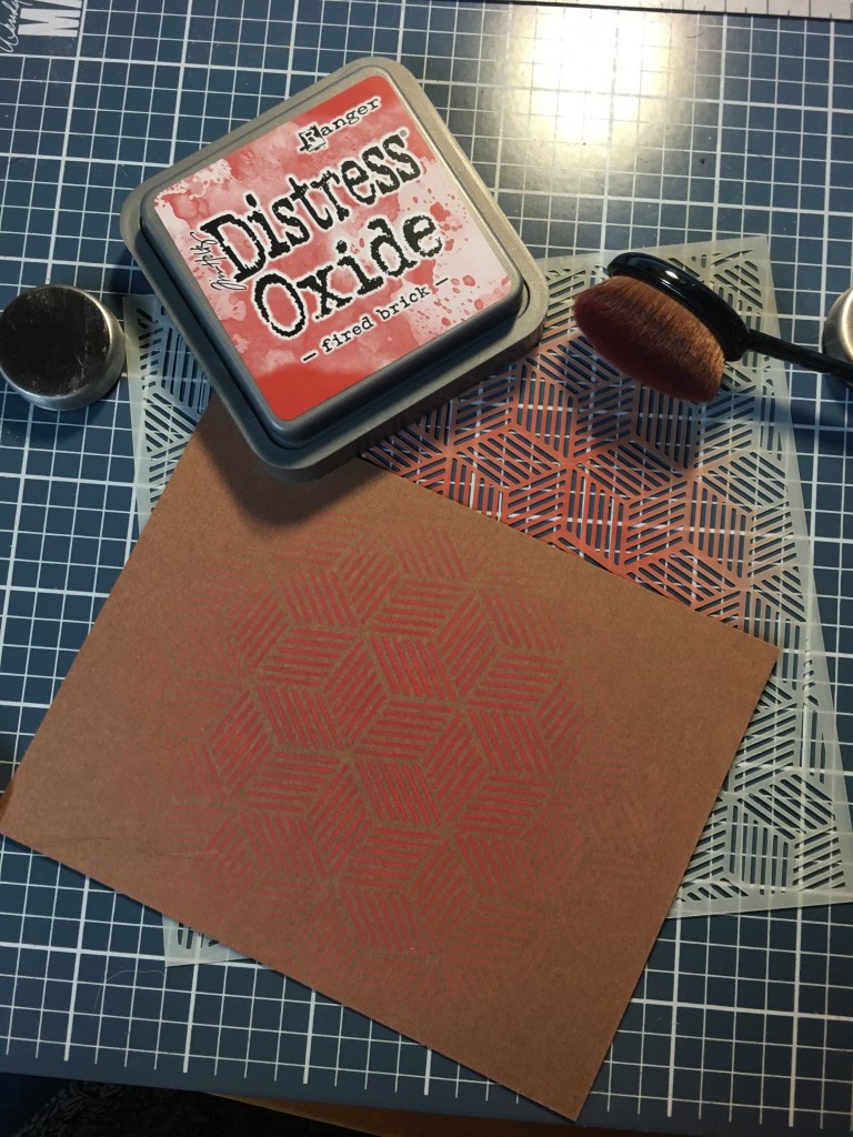 As soon as I saw the kit, I knew I was going to make my dad’s Father’s Day card with it. I had seen Michelle from Pink & Main use the stencil on one of her cards and loved the way it looked, so I wanted to replicate that look on my own card. Instead of using the white card stock, I went with the dark brown card stock from the kit and stenciled it with Distress Oxide Fired Brick ink. I concentrated the color in the center and faded it out from there. I used my Vivace Beauty Brushes and Wendy Vecchi Make It Art Stay-tion to make sure it stay put and that I was getting enough ink on the paper.