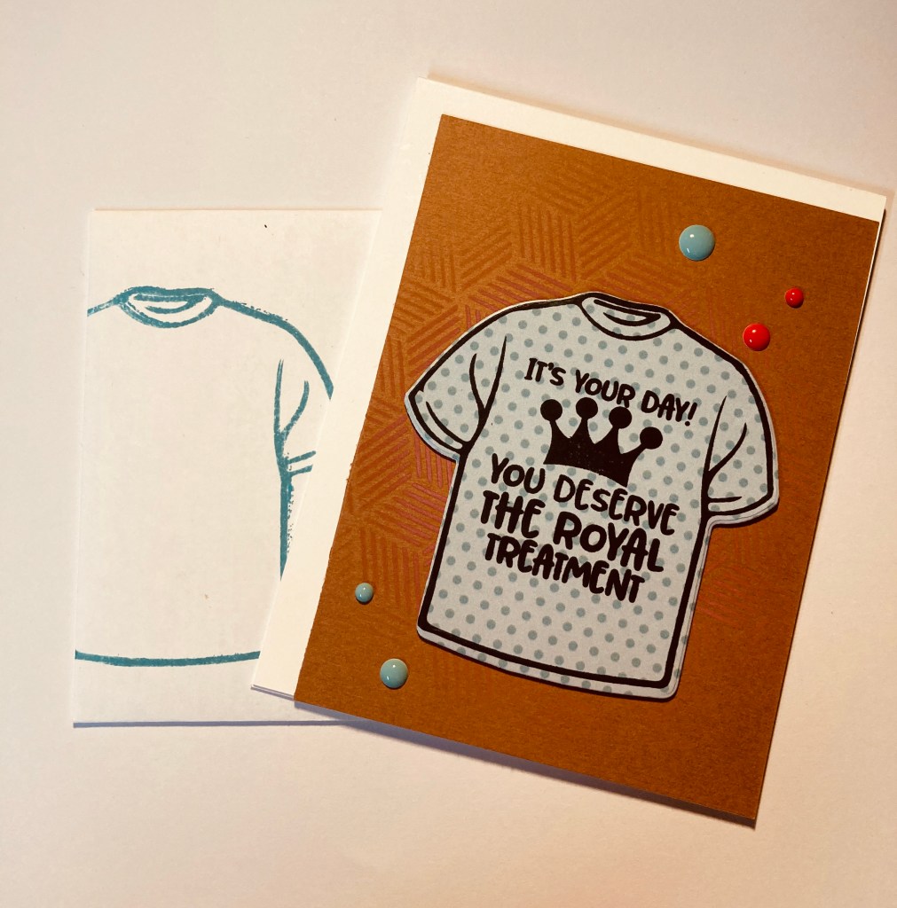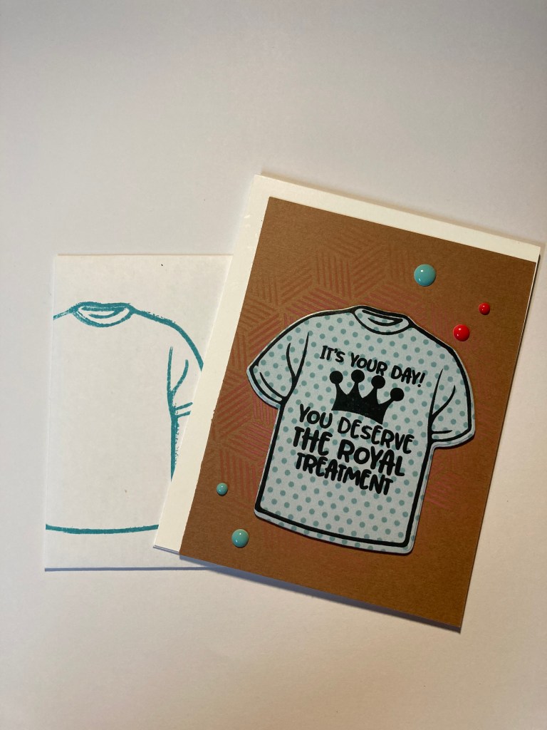 It was a little difficult to tell if it was dark enough due to the color of the ink on the paper, but I was pleased with the result. Next, I stamped the t-shirt on some patterned paper. I had selected the sentiment “It’s Your Day You Deserve The Royal Treatment” and I stamped it onto the patterned paper after I stamped the shirt. I cut out the t-shirt and sentiment, popped the shirt up on some low-profile foam tape and adhered it to my stenciled background.