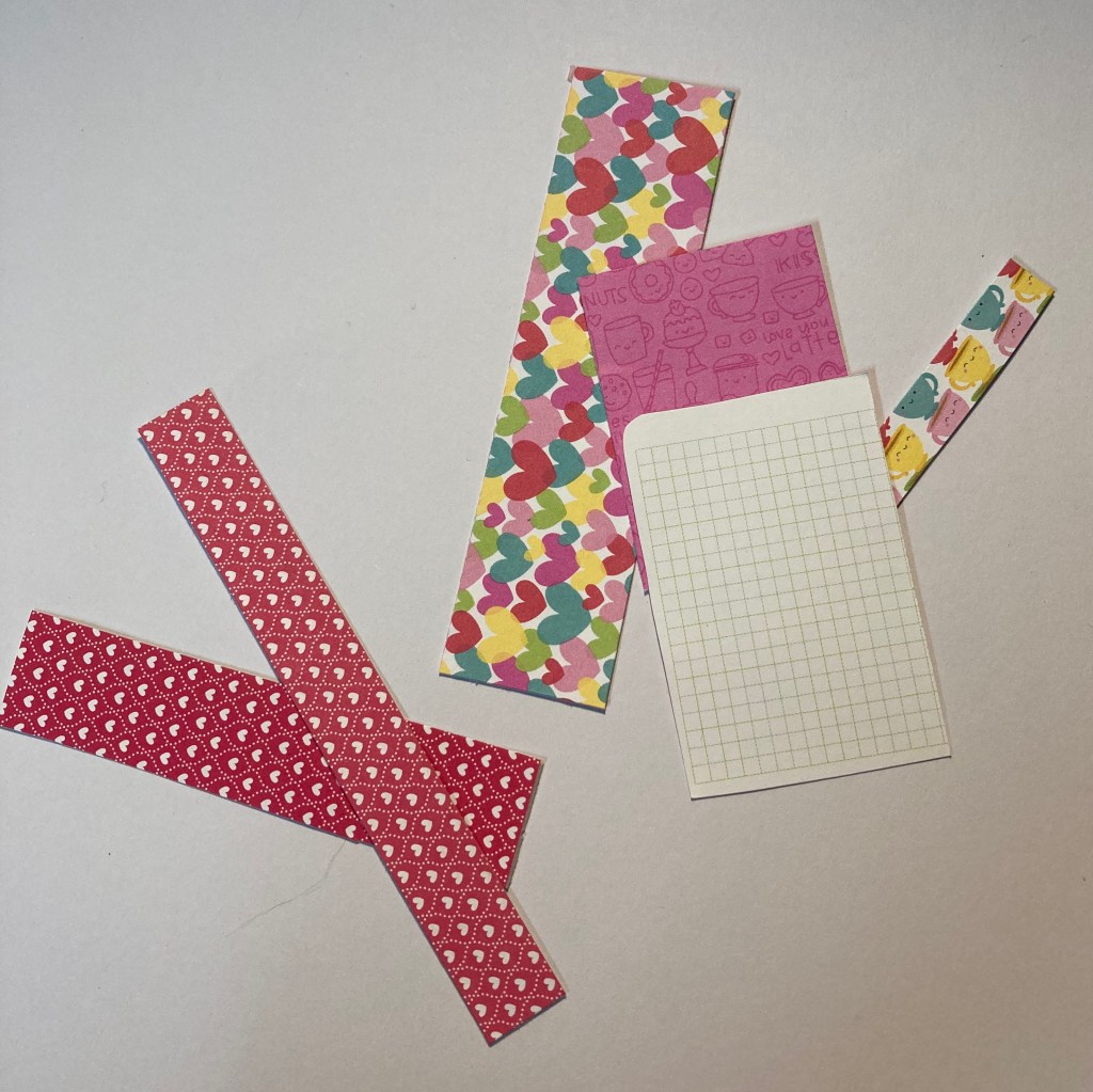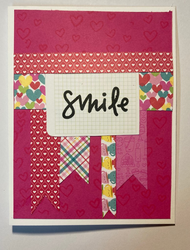 I really wanted to use those last few scraps, so I dug through my card stock, brought out a piece of dark pink paper from a Michaels pack called Pink Buttons and trimmed out a 4″x5.25″ card panel.The Avery Elle Cool Beans stamp set has several small hearts in it, so I arranged them on a stamp block, pulled out the Alte New ink set in Red Cosmos and selected Coral Berry to do some tone on tone stamping. I cut some of the scraps into banners and stamped the sentiment Smile from the Concorde & 9th Dahlia Turnabout stamp set in Momento Tuxedo Black ink. I glued the entire thing onto a precut, pre-scored card base and voila! I used every piece of usable scrap.