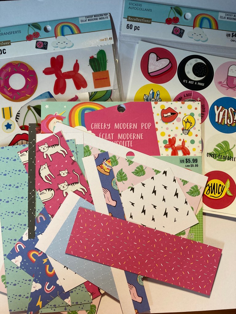 So instead I chose two collections from Recollections in 2017, the Cheeky Modern Pop and the Summer Fiesta collections. As of right now, Michaels online only has the Cheeky Modern Pop icons paperclips and a lot of different Summer Fiesta washi tapes. Since not all Michaels are created equally, you can frequently find part of collections at one Michaels and other parts at other locations. I bought these when I happened to be in Gig Harbor, WA and bought what they had in stock; the paper pads for both collections, the ephemera for Summer Fiesta, and rub-ons and stickers for Cheeky Modern Pop (from hereon out referred to as CMP).