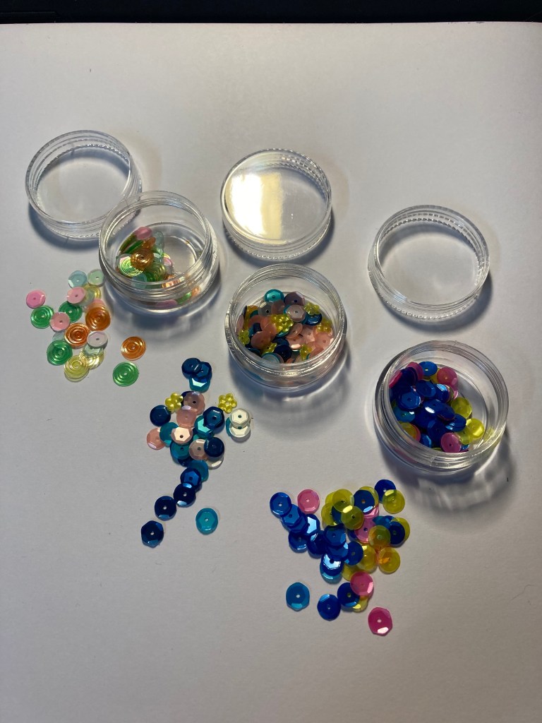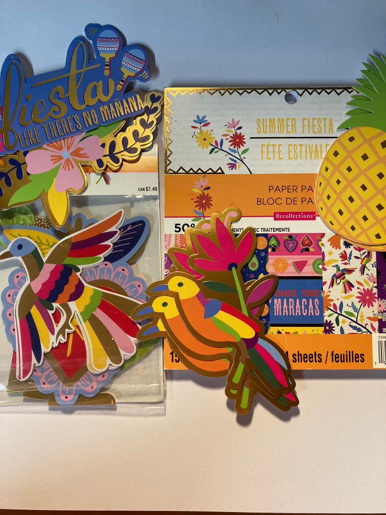 I decided to pull in some card bases I have that aren’t the best quality, but the colors match pretty well with both paper collections. I also pulled in some sequins to use as embellishments. Chances are good I’ll use other sequins in my collection, if only to really highlight the gold accents in the Summer Fiesta paper pad.