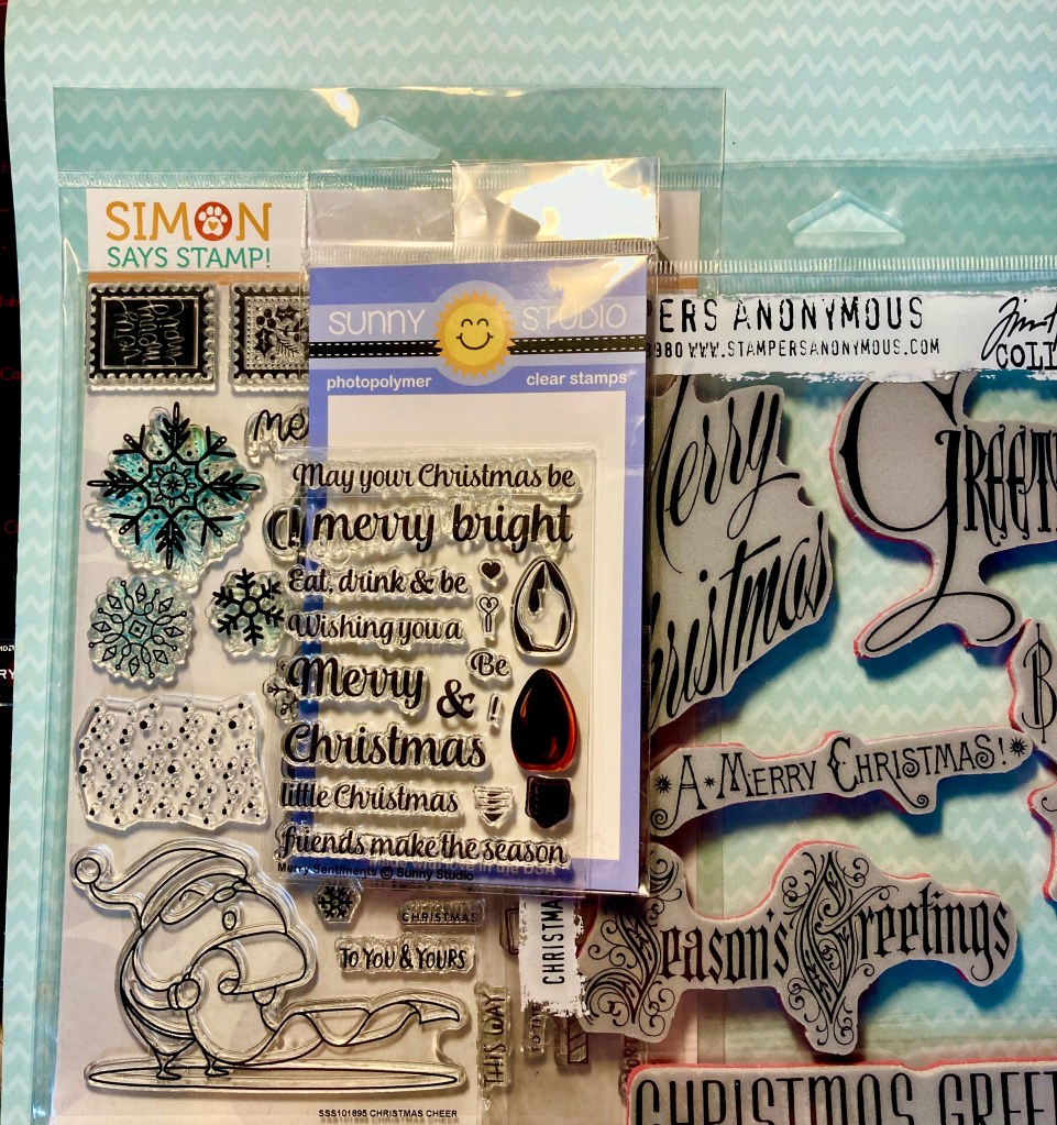 I pulled out so many Christmas and winter related stamp sets, but the first time around, I’m going to stick to the Christmas stamps. I’ll incorporate the winter stamps possibly later. The three sets above are Christmas Cheer by Simon Says Stamp, Tim Holtz Stampers Anonymous Christmas Time CMS352, and Sunny Studios Merry Sentiments. This last one seems perfect for the tag size I’m starting with, so I think I’ll end up using them a lot.