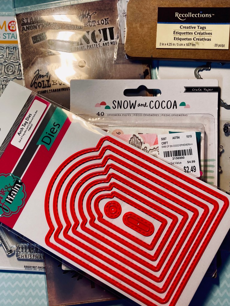 The other items I’ll be using are first and foremost, the Recollections Creative Tags in Kraft. I’ve had them for years and always intended to make tags for the front of cards or for gift giving, but they just hung around. My goal is to use up all of them. I have a pack of Snow & Cocoa ephemera I bought last year at Tuesday Morning. It has a variety of card stock and acrylic pieces, banners, little postage stamps, and other cute things. While this collections is discontinued and is no longer available, I did just see different parts of the collection at my local Tuesday Morning.