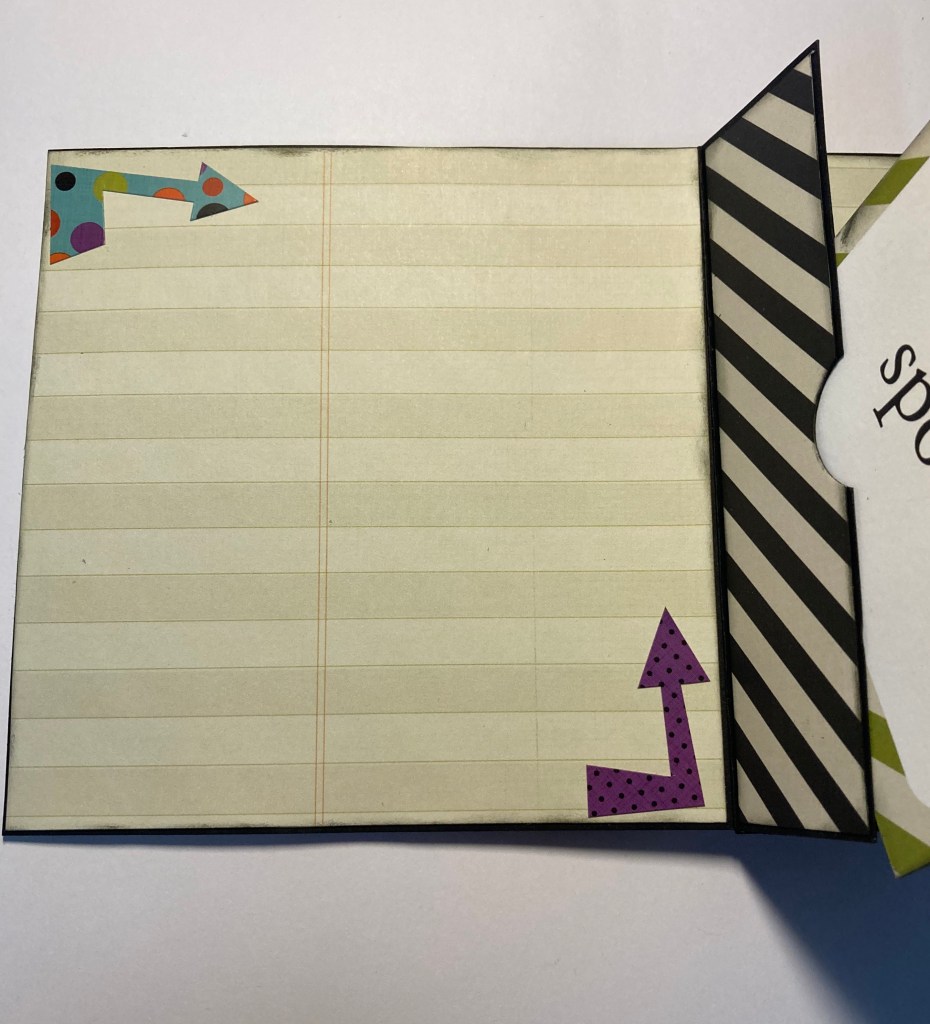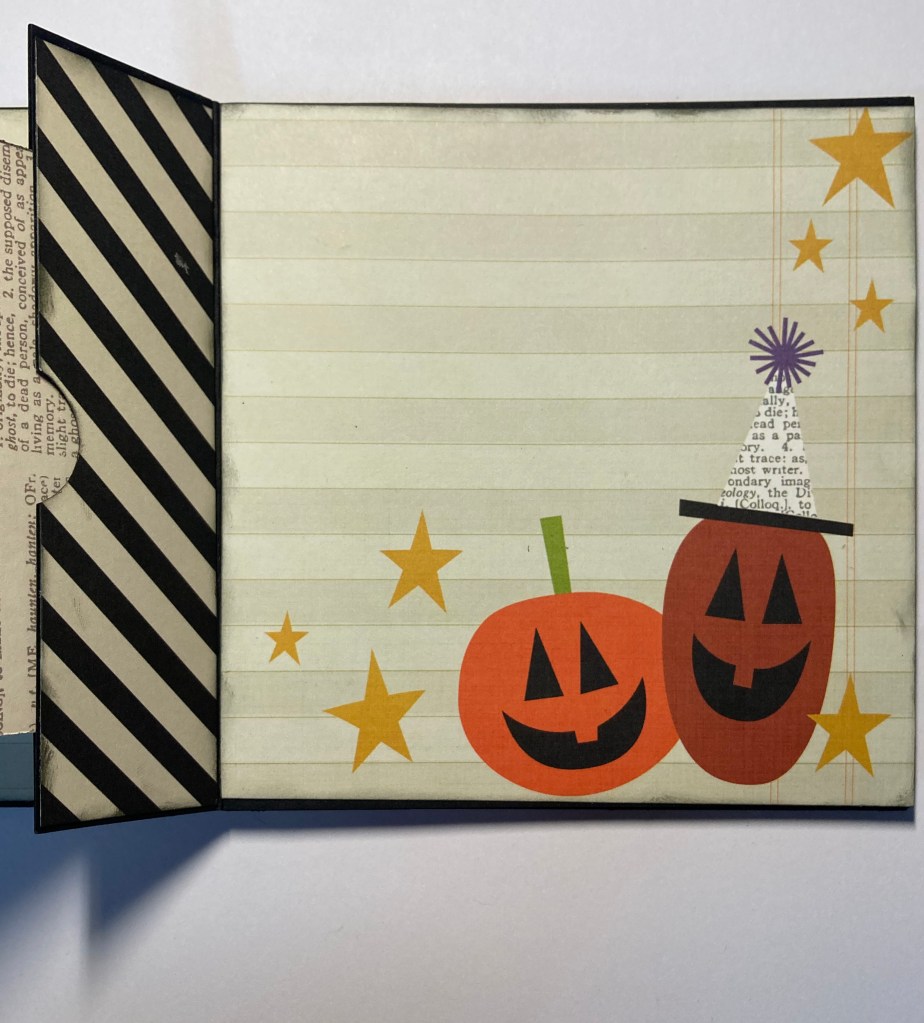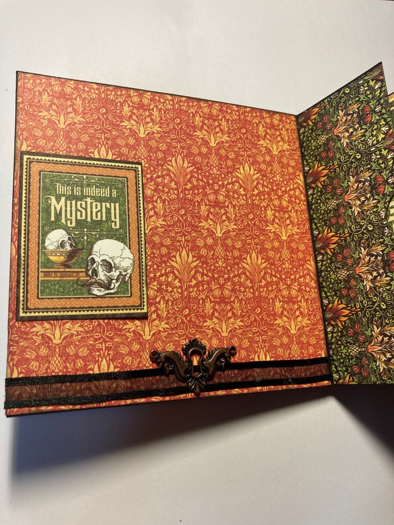 I have quite a few Halloween items in my collections. Most of my collection comes from Recollections brand, but I also have some Carta Bella Happy Halloween, Simple Stories Frankie and Friends (retired), and a Graphic 45 collection that is Halloween adjacent, the Master Detective design. I have the 8×8 paper pad, ephemera, and cards. Rather than pulling out my Recollections paper pads, I chose to work with the Simple Stories 12 x 12 collection, and the things I had from Master Detective. I had already used a bit of the Frankie & Friends paper on a cute paper bag mini album I made a few years ago, and I wanted to see how much more I could use up. The answer is…I still have a lot of paper and stickers to use up.