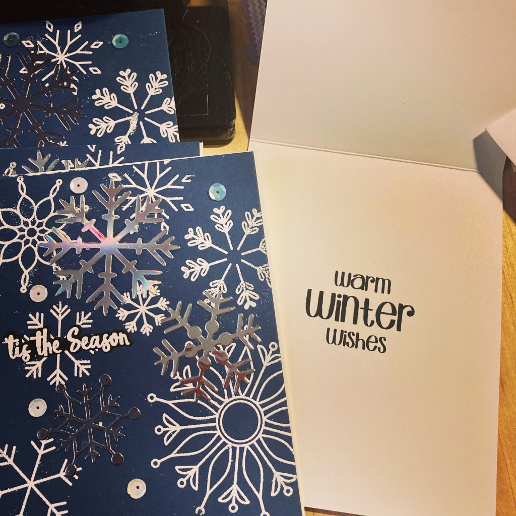 The nice thing about the Sizzix set is that it comes with a die for the sentiment, so I stamped and embossed a bunch of them and was able to cut out the best ones. I then glued everything down; first the snowflakes, then the sentiments. I then stamped Warm Winter Wishes inside each of my A2 standard sized card bases, followed by attaching the card fronts to the card bases. Finally, I attached the sequins, let them all dry completely, addressed the envelopes, and wrote personal messages in each card. The next day they all went in the mail.