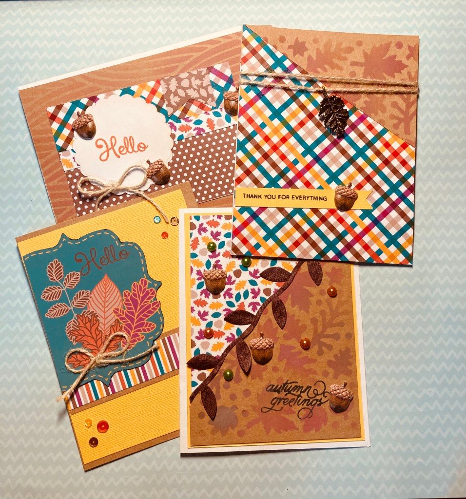 I think some of my favorite cards to make are fall themed ones. I love the colors and how you can incorporate rich colors and the thankful theme. Hence, the cards I created above.