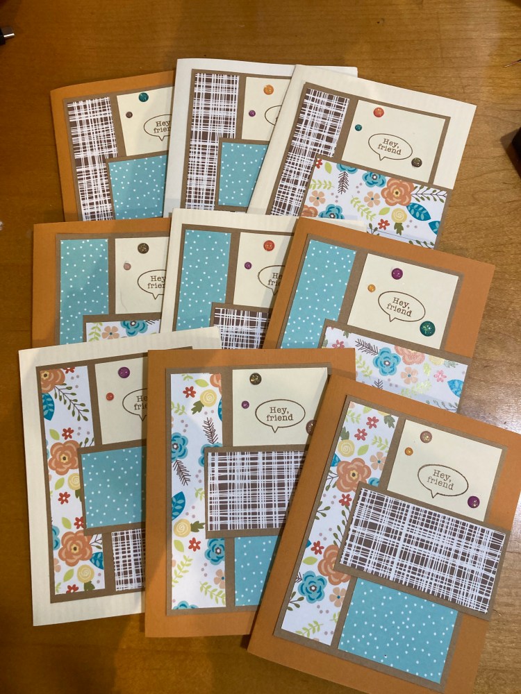 For November, we had the option to choose whatever we wanted to smash. I wasn’t ready to say goodbye to fall-themed cards AND I really wanted to use Call Me (Crafty Al’s October Show Us Your Sheetload sketch. All that to say, I made 9 fall cards using an old Pink & Main kit following the sketch. The sentiment came from a Simon Says Stamp 6×8 stamp set.